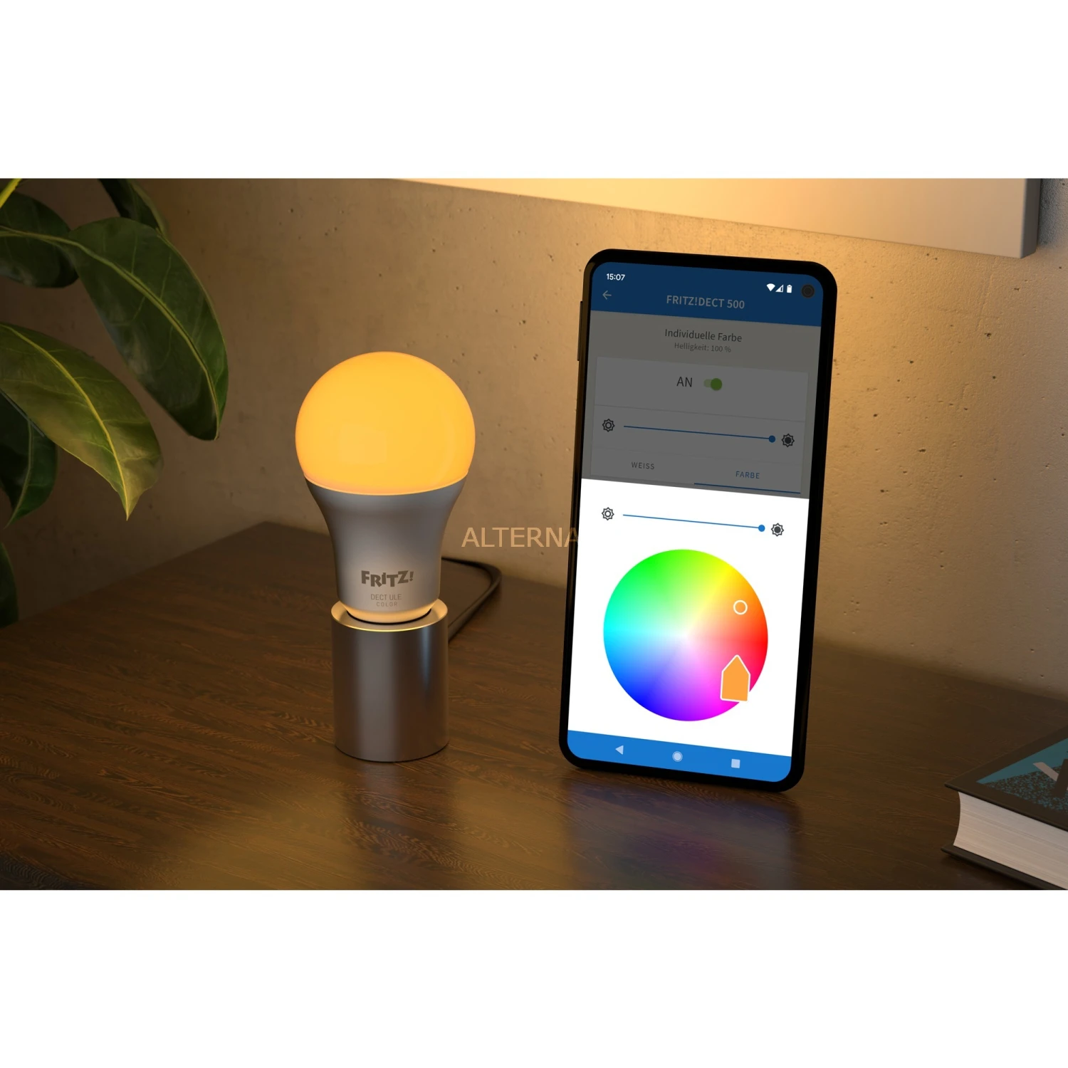Mit der FRITZ!DECT 500 kommt farbiges Licht ins eigene Zuhause. Diese smarte LED-Lampe für den Sockel E27 lässt sich ganz einfach in das FRITZ!-Heimnetz einbinden. Damit stehen vielfältige Steuerungsmöglichkeiten zur Verfügung: per App auf dem Smartphone oder auf anderen mobilen Endgeräten. Neben Farbtemperatur und Helligkeit lässt sich die Beleuchtungsfarbe anpassen – ganz nach Wunsch, zeitgesteuert und immer der Situation angepasst.