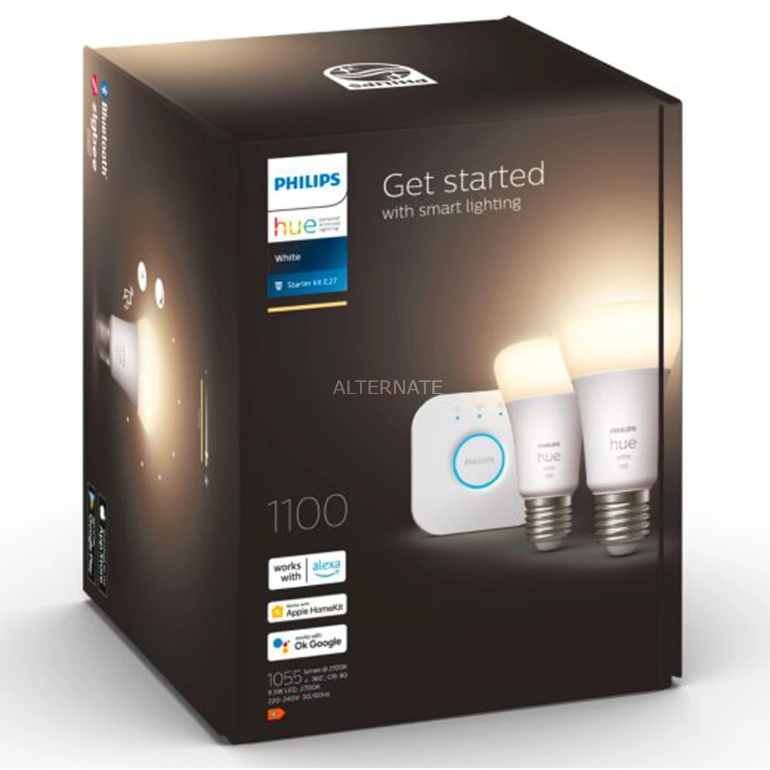 Das Hue White Starter-Kit E27 ist der einfache Einstieg in smarte Beleuchtung zu Hause. Dieses Set enthält zwei über Bluetooth, Zigbee oder eine Hue Bridge steuerbare LED-Lampen, die ein warmweißes, dimmbares Licht mit einer Farbtemperatur von 2700 Kelvin erzeugen. Dabei bieten sie hohe Energieeffizienz und eine Nennlebensdauer von bis zu 25000 Stunden. Mit im Lieferumfang ist außerdem eine Hue Bridge, die nicht nur zur Steuerung der zwei im Set enthaltenen Lampen, sondern auch als Basis einer größeren Hue-Umgebung eingesetzt werden kann.
